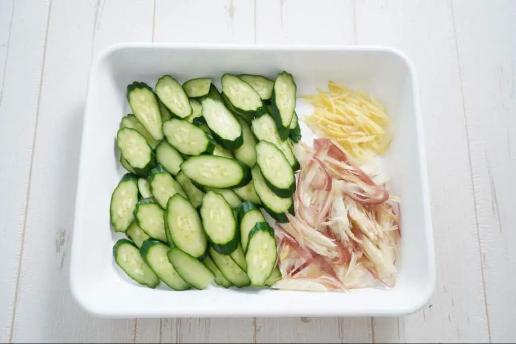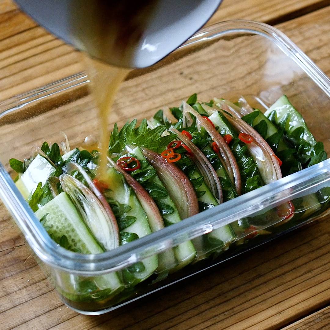 大量消費に!人気の作り置き常備菜。ポリポリきゅうりとみょうが大葉しょうがのさっぱり漬け - つくりおき食堂。