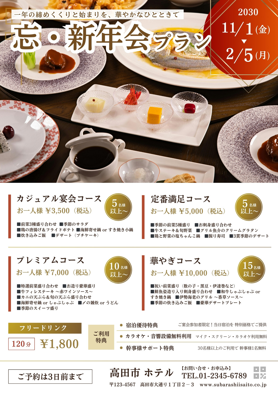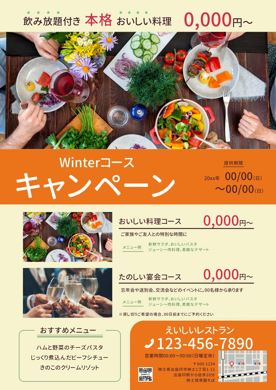 コース料理を紹介できる冬セールのチラシの無料チラシテンプレート 16796 - デザインAC。