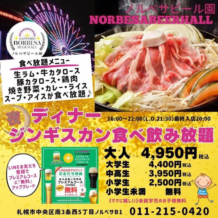 ディナー限定 生ラムジンギスカン120分食べ飲み放題コース☆4950円 税込 ☆サッポロ ノルベサ ビール園 SAPPORO nORBESABEER HALL。