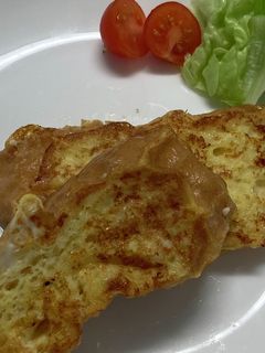 Recipe『お砂糖なしのフレンチトースト。』 我が家のフレンチトーストは 卵液にお砂糖を入れずに作る甘くないもの。 卵1個に対して牛乳100cc混ぜた 卵液にお好みで塩少々。なくても可。パンを浸してたっぷりのバターで焼く。 ハムやチーズを合わせることもできるし。