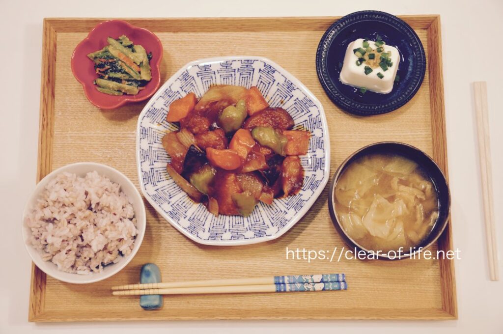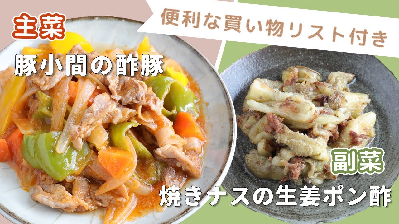 「豚小間の酢豚」「焼きナスの生姜ポン酢」献立。