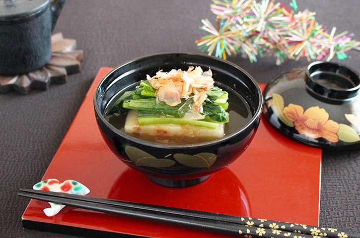 京料亭白だしで簡単♪名古屋の定番!澄まし汁仕立て角餅と餅菜の雑煮。