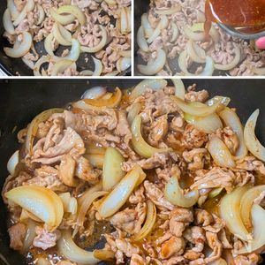 豚こま切れ肉と新玉ねぎの生姜焼き。