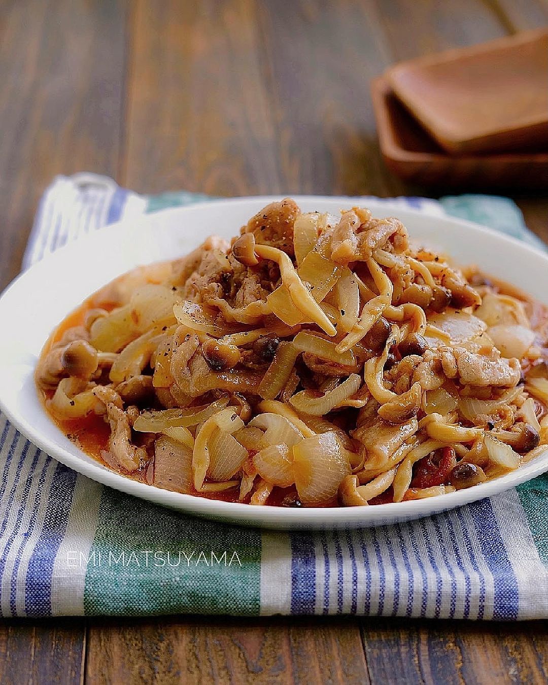 豚こまと玉ねぎと椎茸のスパイシー生姜焼き。