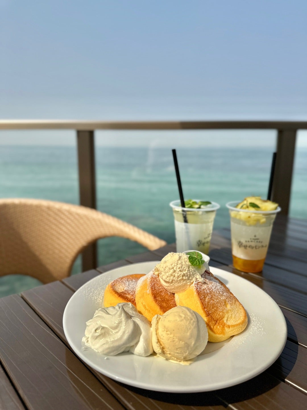淡路島にいながら南国リゾート気分✨, 「幸せのパンケーキ淡路島リゾート」の 淡路島テラス では、ふわふわパンケーキはもちろん、トロピカルドリンクや海を一望できる席、フォトスポットも充実🏝️,まるで海外旅行に来たような特別なひとときを体験できます。, 📍幸せのパンケーキ 本店 淡路島テラス, 兵庫県淡路市尾崎42-1,平日:10:00~20:00 LO18:45 ,。