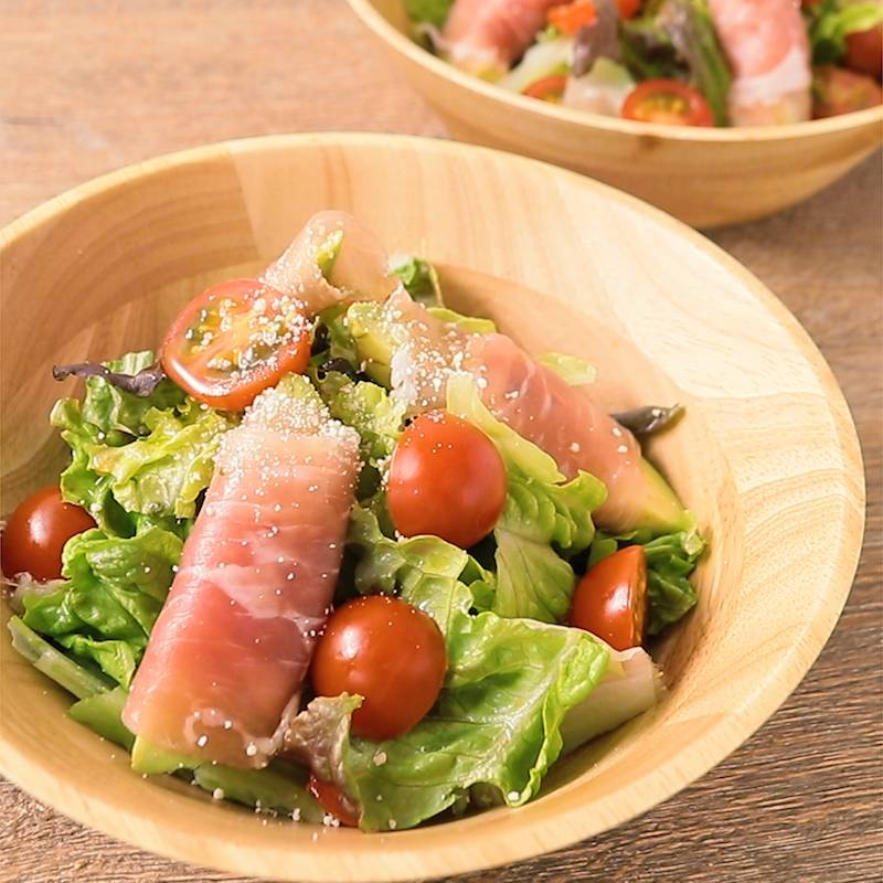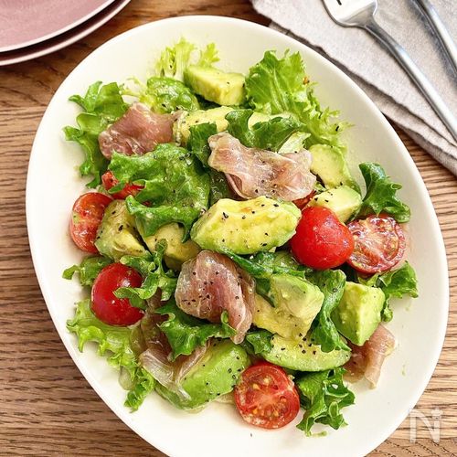 \5分でやみつき 生ハムとアボカドのうまドレサラダ。