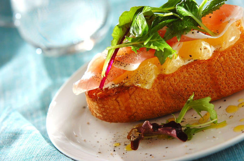 グレープフルーツと生ハムのタルティーヌ 副菜。