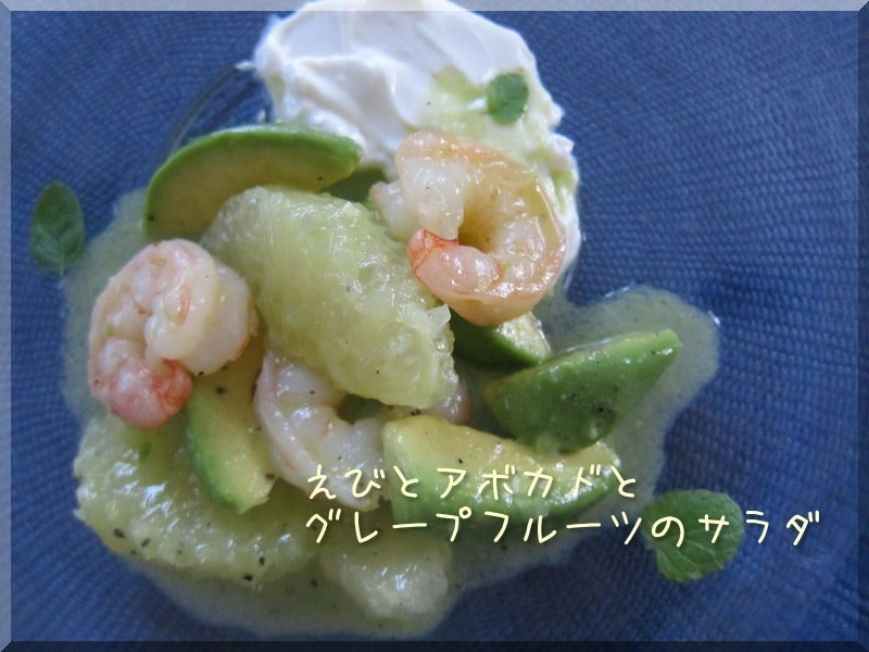 エビとアボカドとグレープフルーツのサラダ ~塩ヨーグルト添え~さくらのおうちカフェ。