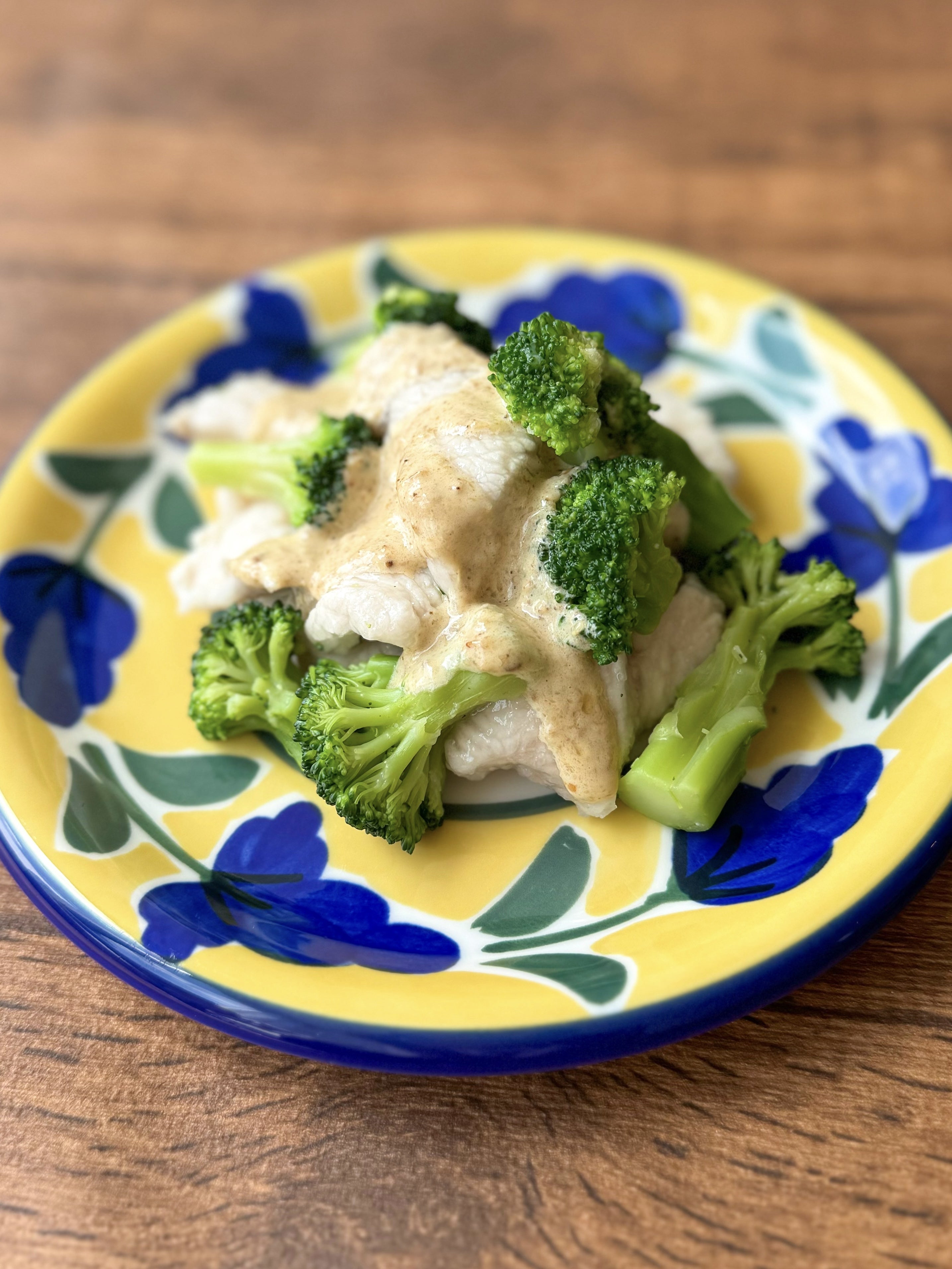 たんぱく質34.6g♪ 鶏むね肉とブロッコリーのごまだれサラダ。