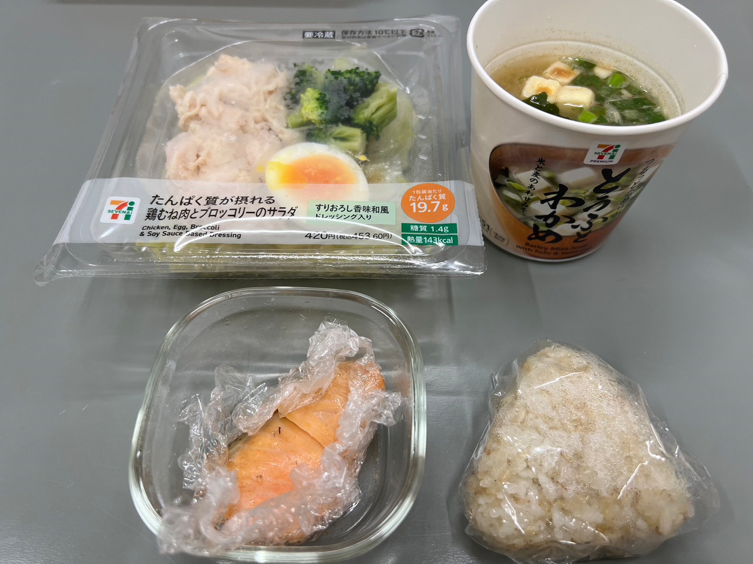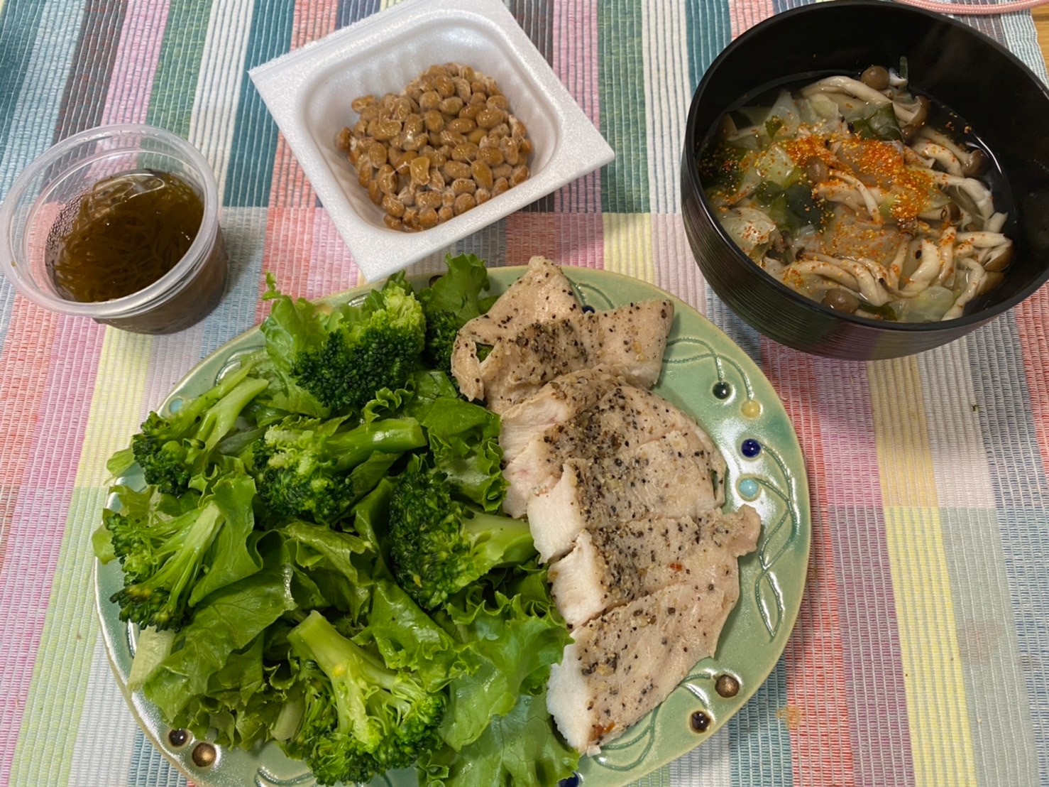 ダイエット食事例 ブロッコリーと鶏胸肉、キノコ味噌汁 納豆、もずく 福岡のパーソナルジム・ピラティスブログ「ダイエットは明日から」。