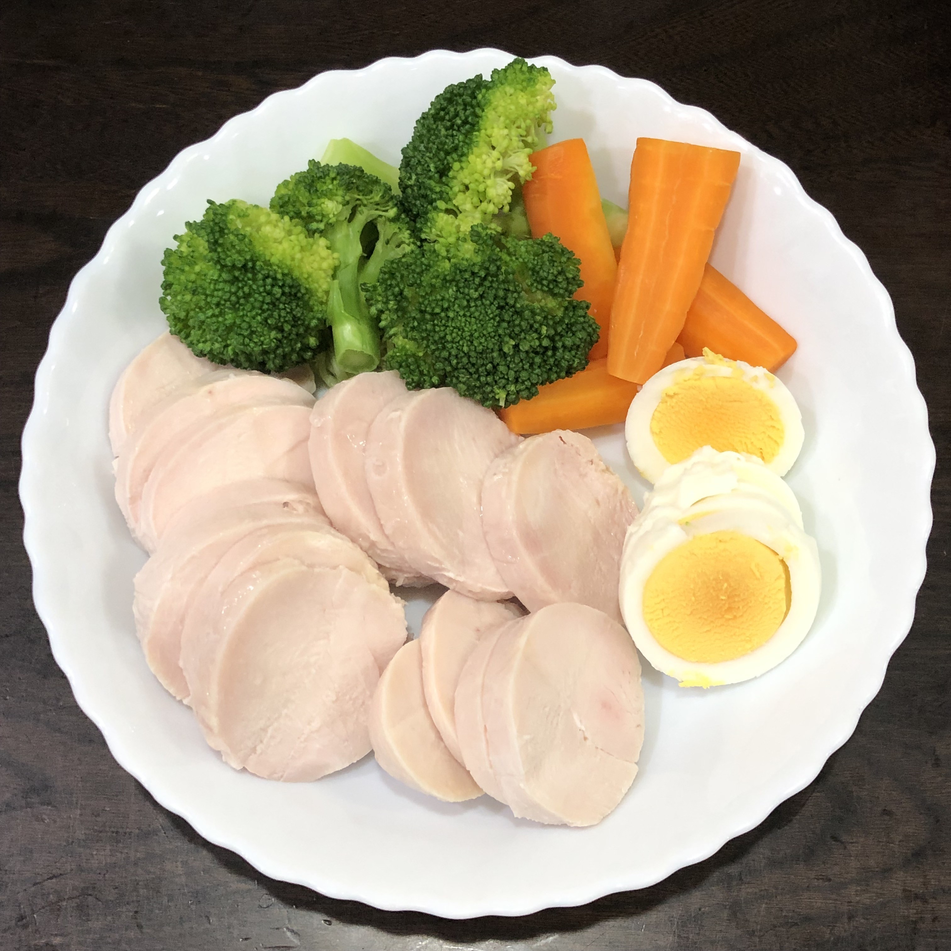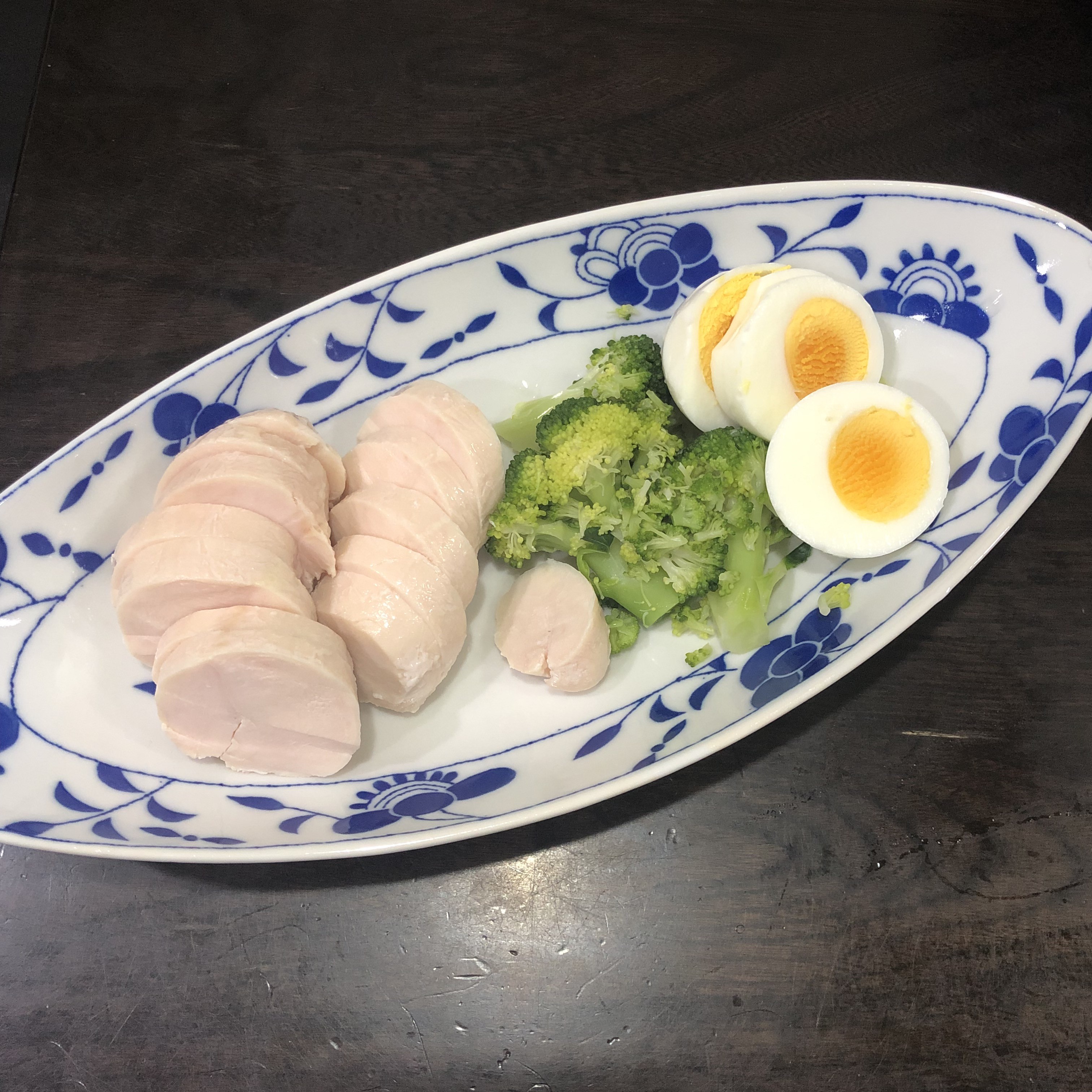 ダイエット・ボディメイク食事例 鶏胸肉、ブロッコリー、蒸しいも・キャベツ・もやし、ゆでたまご 福岡のパーソナルジム・ピラティスブログ「ダイエット は明日から」。
