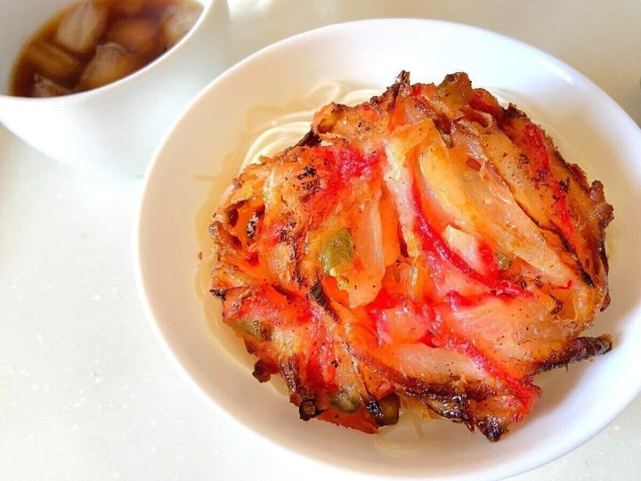 くるみ on X: "久しぶりに業務スーパーで見つけたもの 「紅生姜のかき揚げ」フライパンで焼いて熱々のご飯に乗せて、だし醤油をかけて天丼にしたらめっちゃ美味しかった https:t.co n4kgRhInZ2"X。