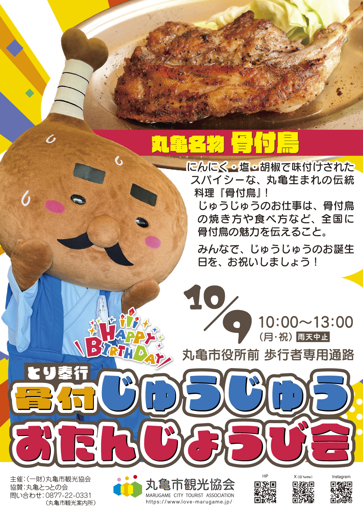 10月10日は丸亀市のマスコットキャラクターである“とり奉行骨付じゅうじゅう”君の誕生日でしたー!🍰✨昨年もにぎやか村に来て会場を盛り上げてくれました😆🙌 お誕生日おめでとう!!!プロフィール生まれたところ香川県丸亀市誕生日10月10日性格無口。