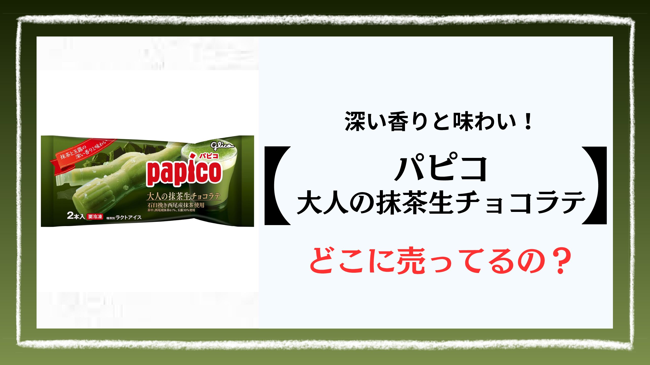 パピコ大人の抹茶生チョコラテ江崎グリコ 🍨259.20円 税込🍨103kcal 🍨2025 8 18〜 去年もめちゃくちゃ感動したパピコの抹茶生チョコラテが帰ってきたー!見た目・構造しっかりと濃い抹茶色のパピコ。 石臼挽きの西尾産抹茶と玉露が使用されています。