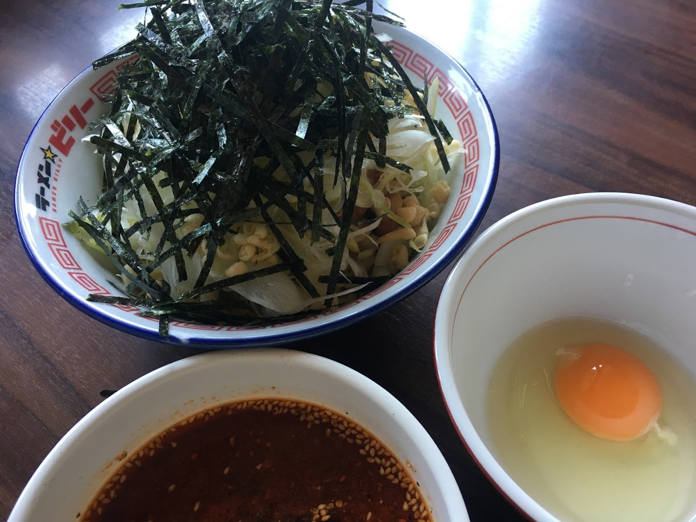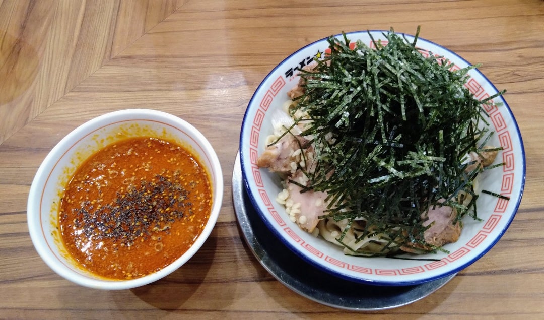 5月の限定メニュー『男の肉盛り ラー油つけそば』日の出らーめん千種分店。