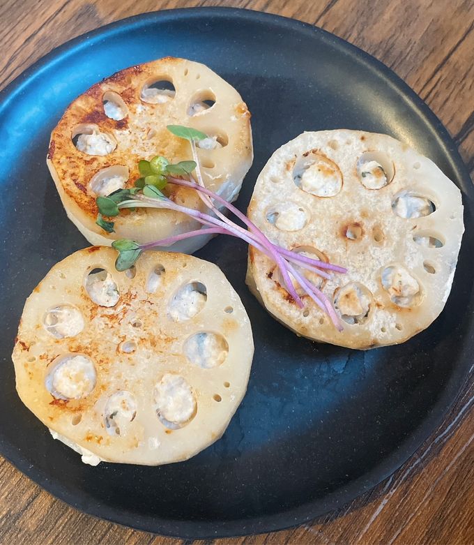 鶏ひき肉と大葉のれんこんはさみ焼き。