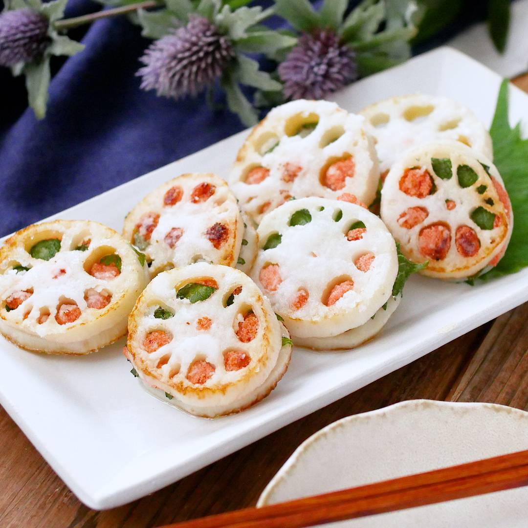 大葉がアクセント! れんこんの明太はさみ焼き。