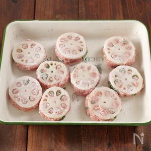 れんこんの豚チーズはさみ焼きのレシピトクバイ。