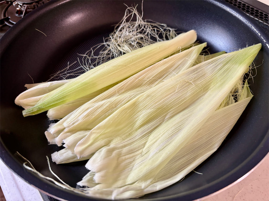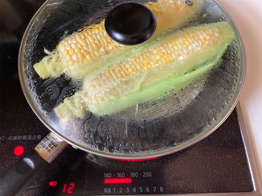 フライパンで蒸し茹でが美味しい!とうもろこしの茹で方。