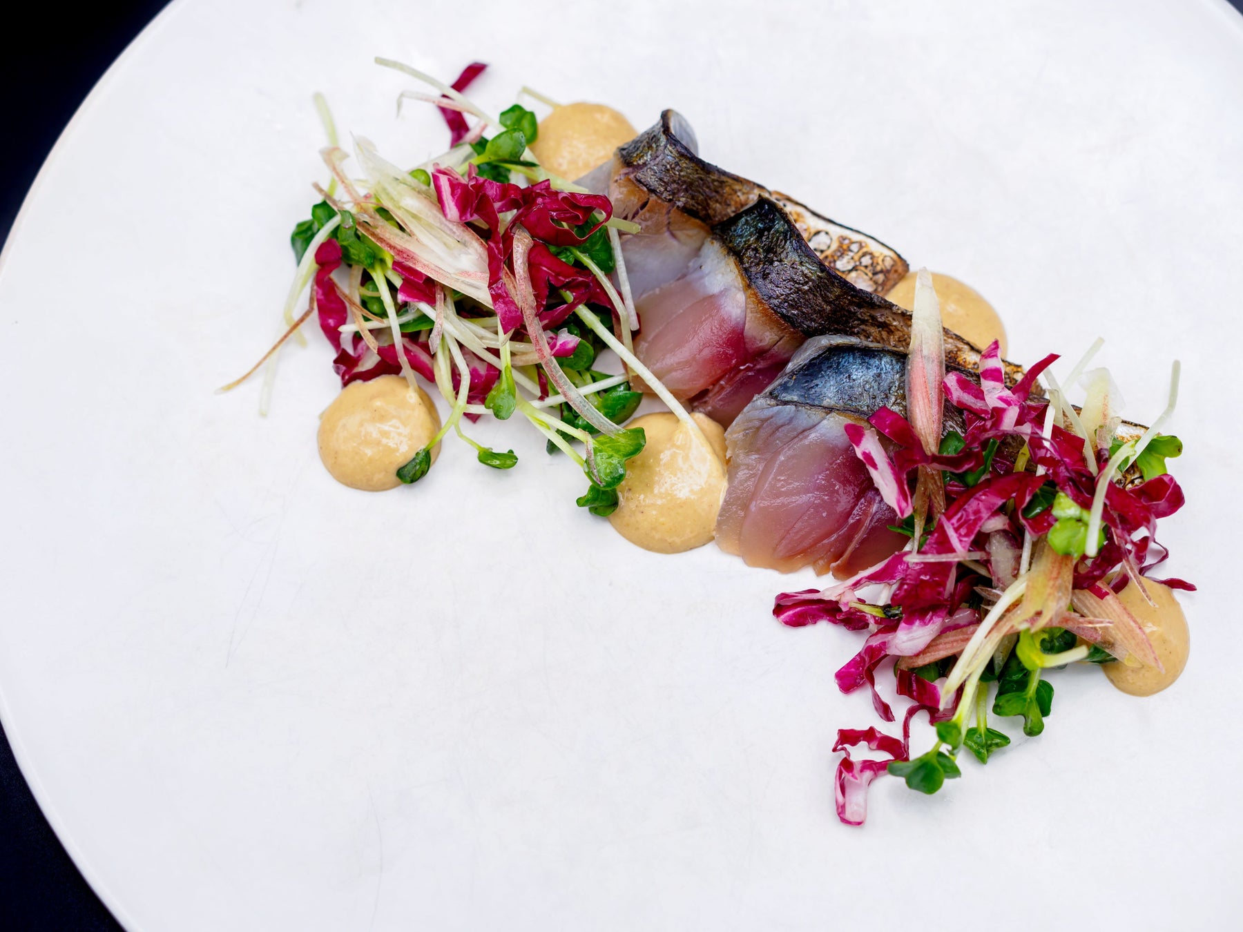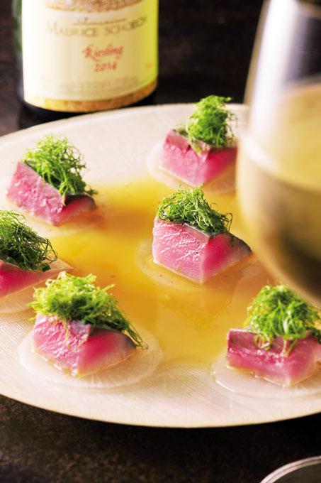 炙りしめ鯖を美しく 65 Maquereaux Marinés au Vinaigre de CidrePurée de Chou-Fleurà la Bonite。