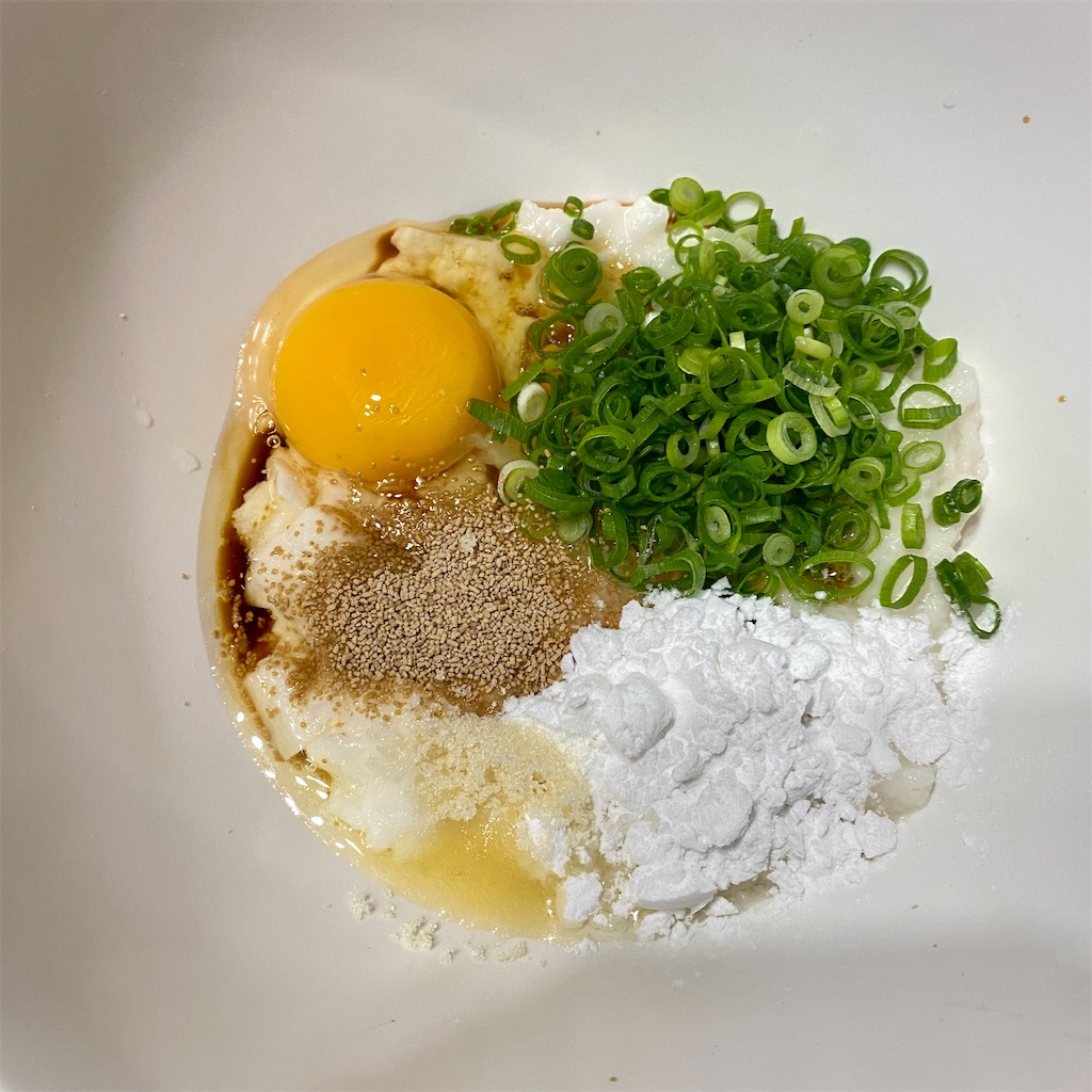 混ぜて焼くだけ!ふわふわめちゃ旨 お疲れ気味の身体に♪美味しさ広がるタレのバリエもあり!!<豆腐ねぎ焼き>。