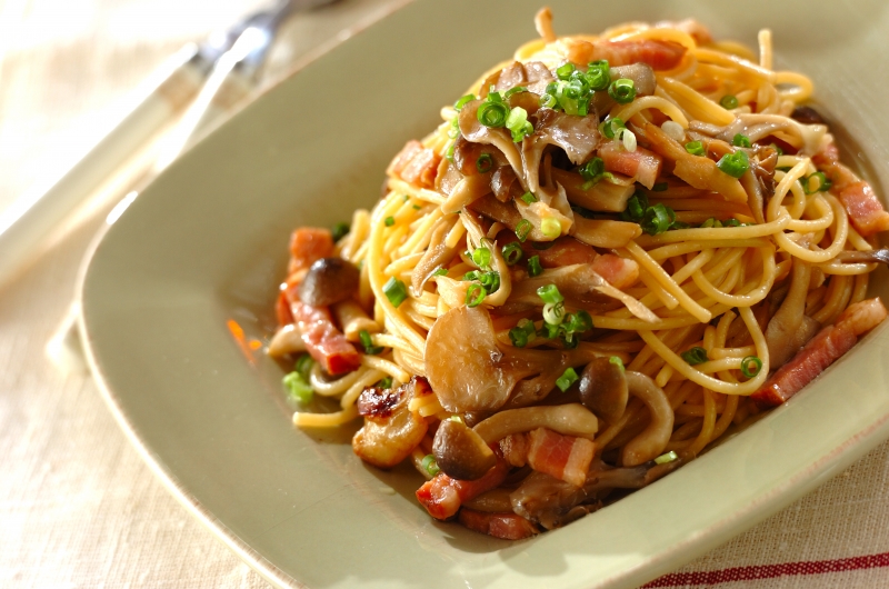 きのことベーコンのバターしょうゆスパゲッティ まいたけとエリンギで人気の和風パスタ。