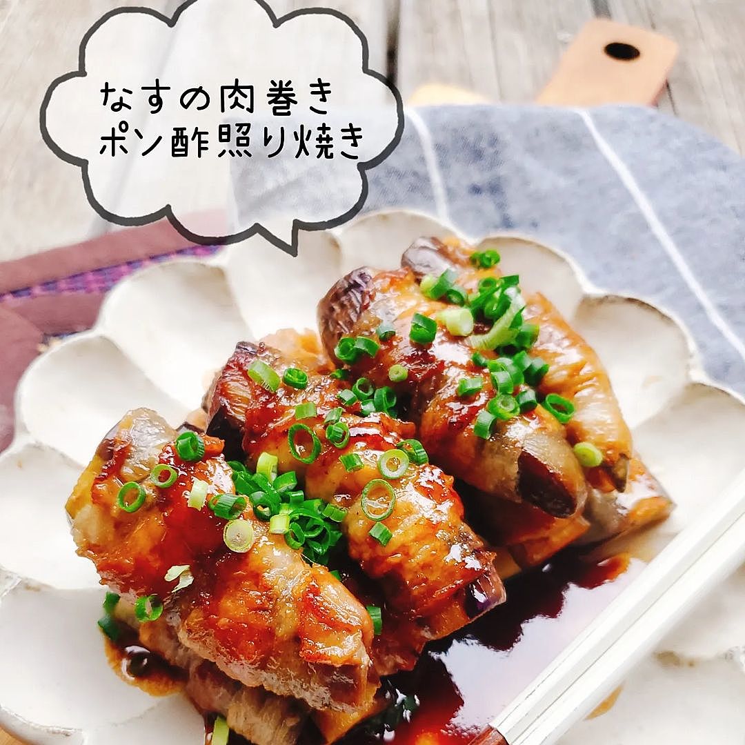 ポン酢で簡単味付け♪ さっぱりなすの肉巻き煮。