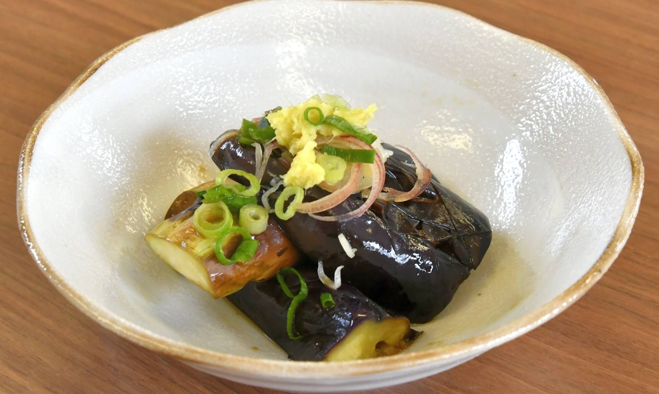 焼きナスのゆずぽん酢がけ旭フレッシュ。