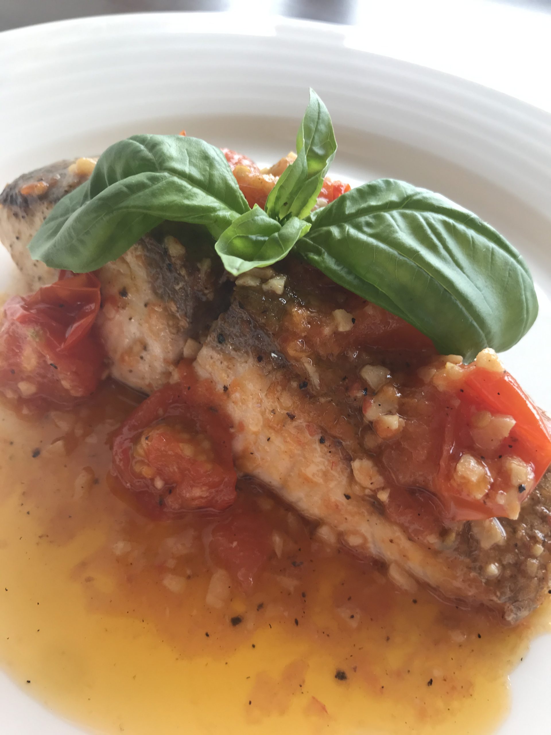 魚料理 スズキのインパデッラ リグーリアソースルパリエ Lepalier。