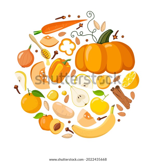 オレンジ色の食べ物。オレンジの野菜、果物、香辛料、種子が丸い。新鮮な有機食べ物、健康的な食べ物。健康のために色を食べなさい。果物と野菜の虹。農家市場の料理用ロゴ」のベクター画像素材 ロイヤリティフリー2022435668Shutterstock。
