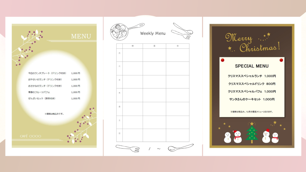 かわいい&おしゃれなデザインから使いやすいシンプルなものまで!メニュー表・献立表のテンプレート素材イラストボックス「プレミアム」テンプレート。