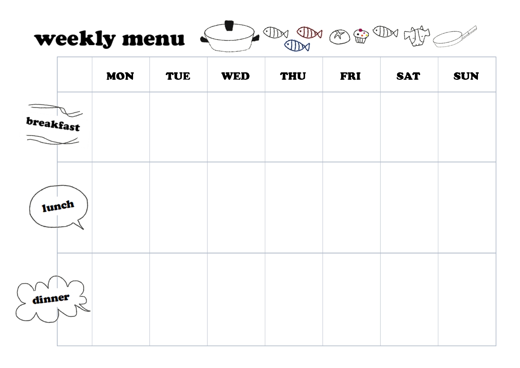 かわいい手書きイラスト入りの1週間の献立表の無料テンプレート 朝・昼・夜 簡単に日々のメニューが作成出来る!可愛いだらけ。