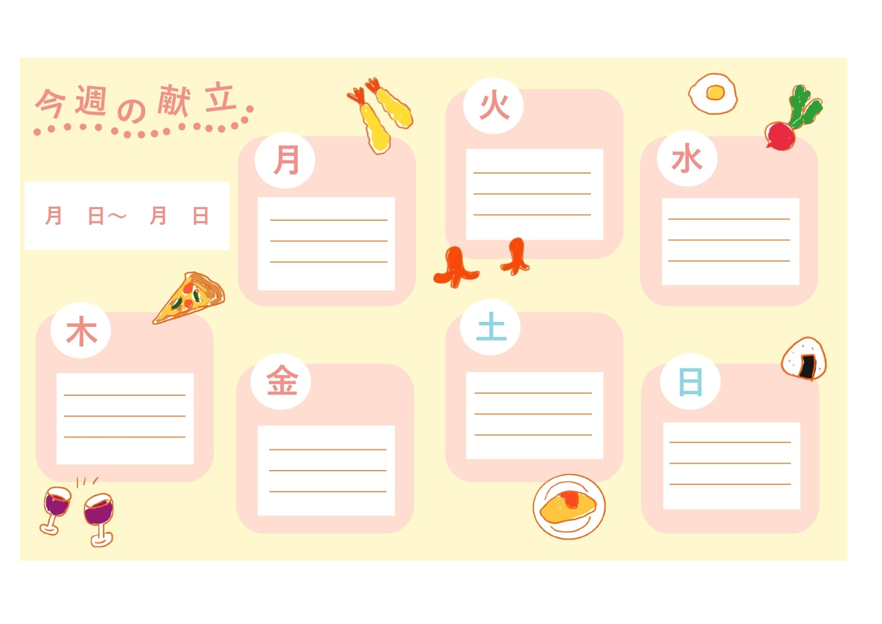 作り方が簡単!1週間のイラスト入り献立表💗無料ダウンロード「かわいい」雛形・テンプレート素材。