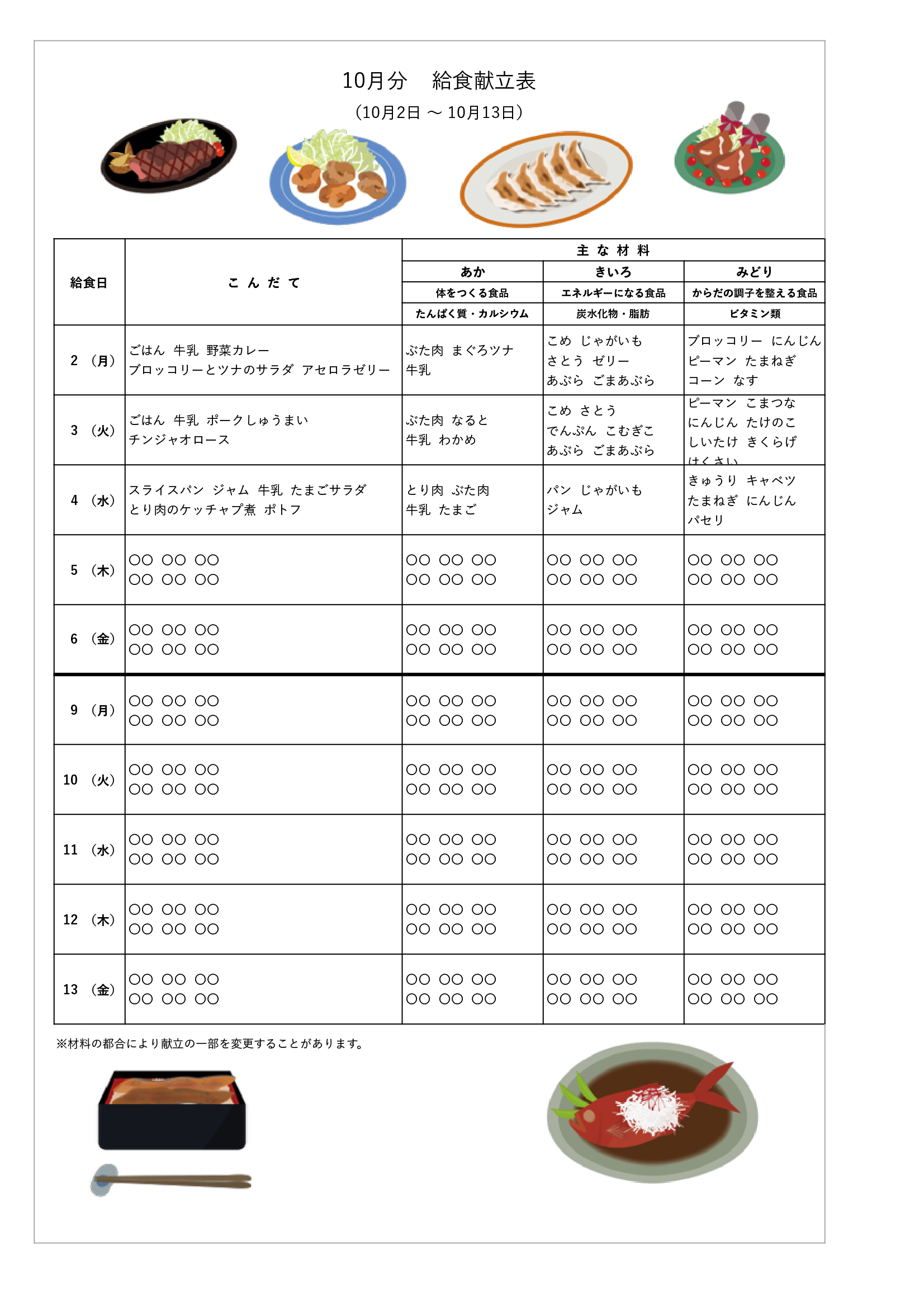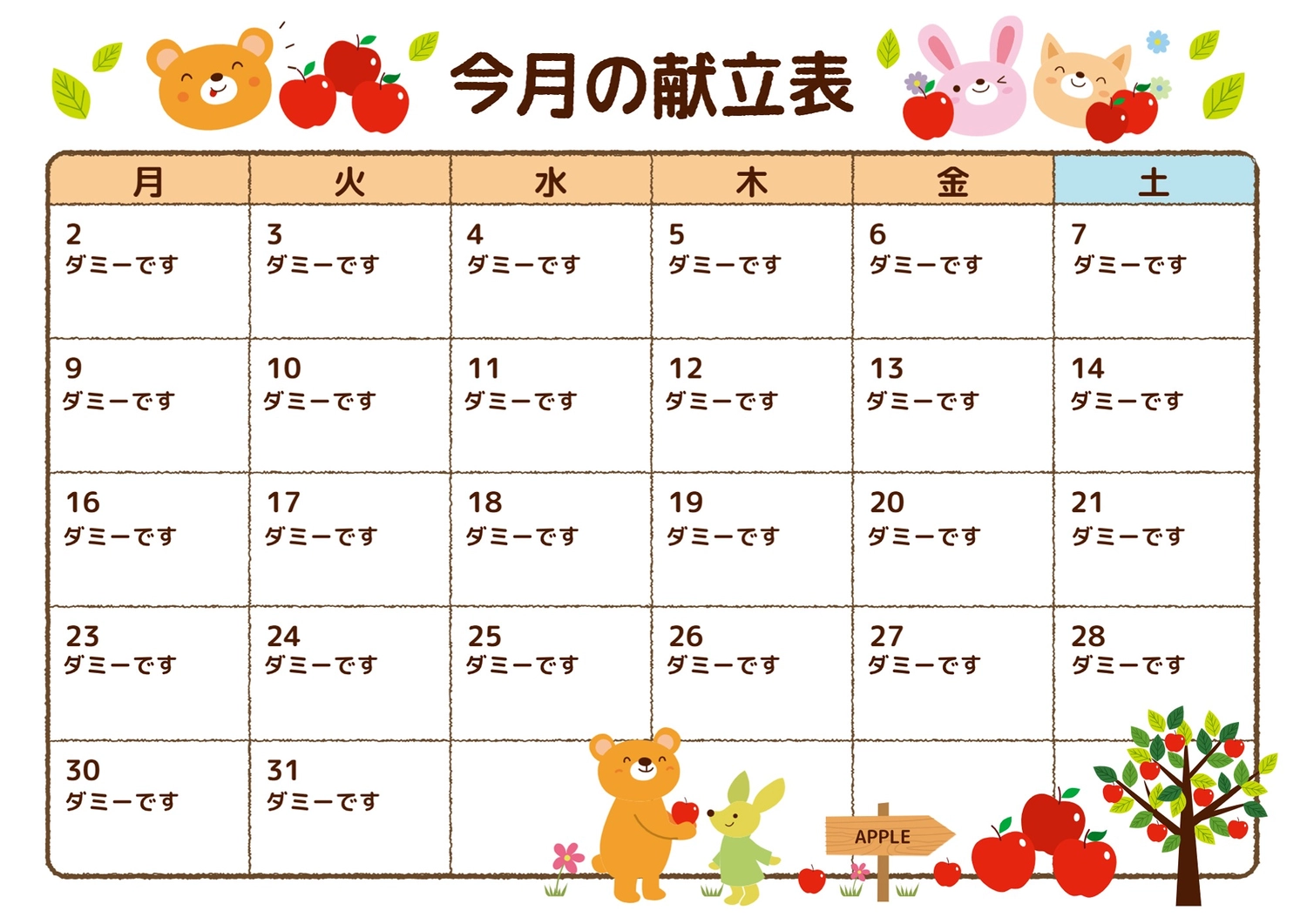 保育園や幼稚園・保育所の給食の献立表 メニュー💗無料ダウンロード「かわいい」雛形・テンプレート素材。