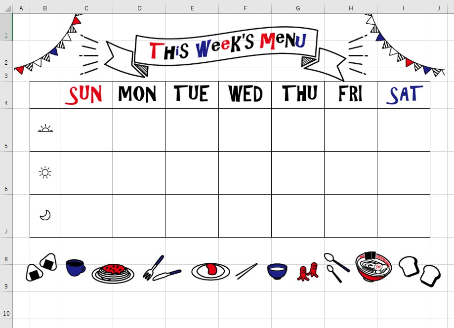 かわいい1週間の献立表のテンプレート「エクセル・ワード・PDF」ダウンロード:イラスト無料。