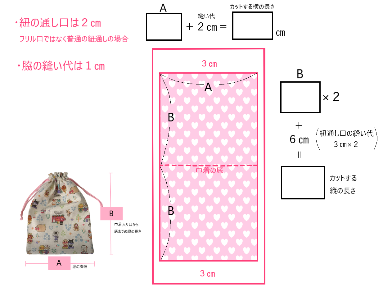 巾着袋 お弁当袋など を手作りする際の大きさ計算方法hapimade手芸教室ハンドメイド・手作りのお手伝い。