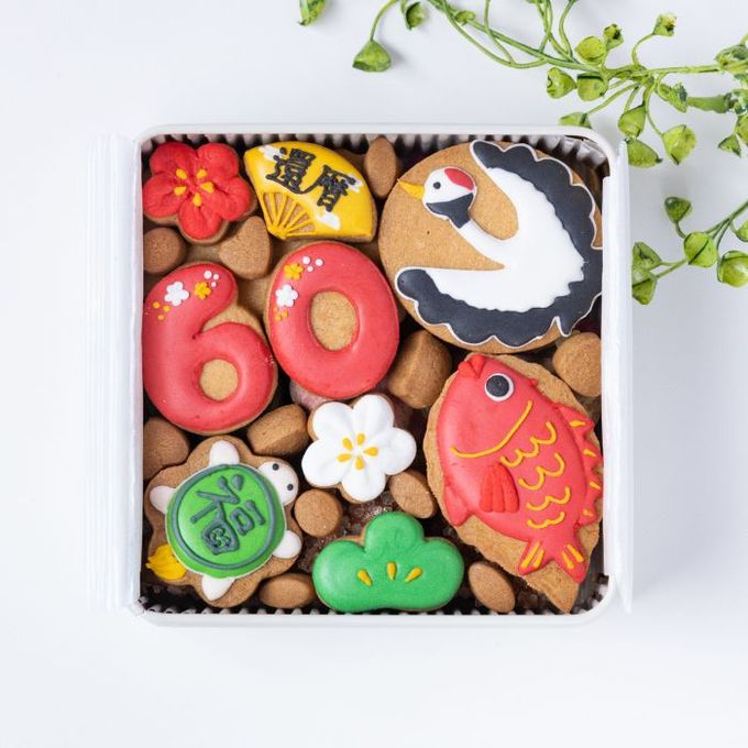 リボンラッピング付き ご長寿お祝い!めでたいver☆アイシングクッキー&ザクザククッキー缶 還暦・古稀・喜寿・傘寿・米寿・卒寿・白寿・百寿 お菓子工房アンドンカフェ Andon CafeCake.jp。