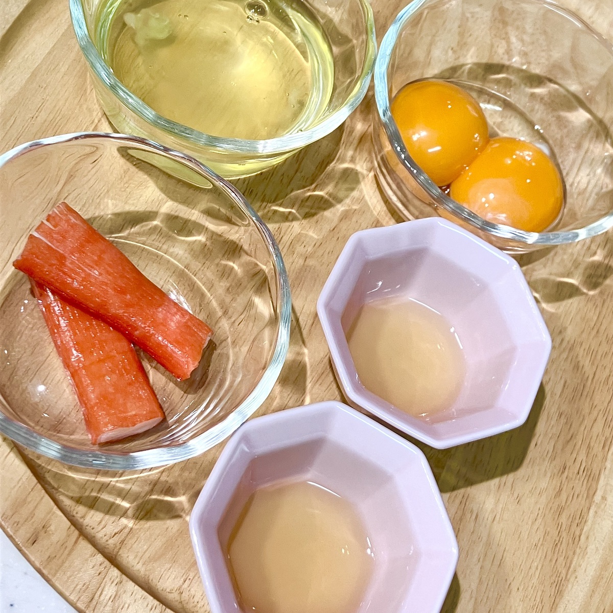 分量 , 卵 ・ 3個, 砂糖 ・ 小さじ2, 白だし ・ 小さじ2, 酒 ・ 小さじ1, 天かす ・ 大さじ3, 水 ・大さじ3 , ・,作り方 , ① 卵以外の材料をすべて合わせる, ② ①にラップをして600Wで30秒チンして冷ます, ③卵を割り、黄身と白身が完全にあわさるまで、箸で切るようにまぜる, ④ ②の粗熱がとれたら③に入れて混ぜあわせる, ⑤。