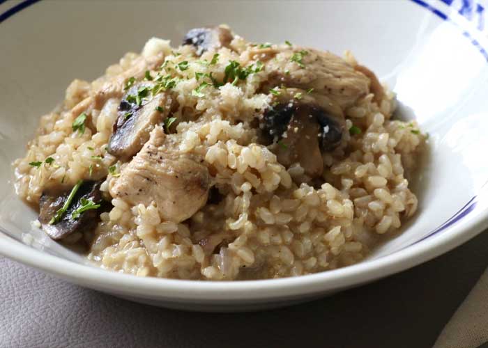 あったかほっこり玄米レシピ「鶏肉とマッシュルームの玄米リゾット」結わえるオンラインストア本店 寝かせ玄米公式販売。