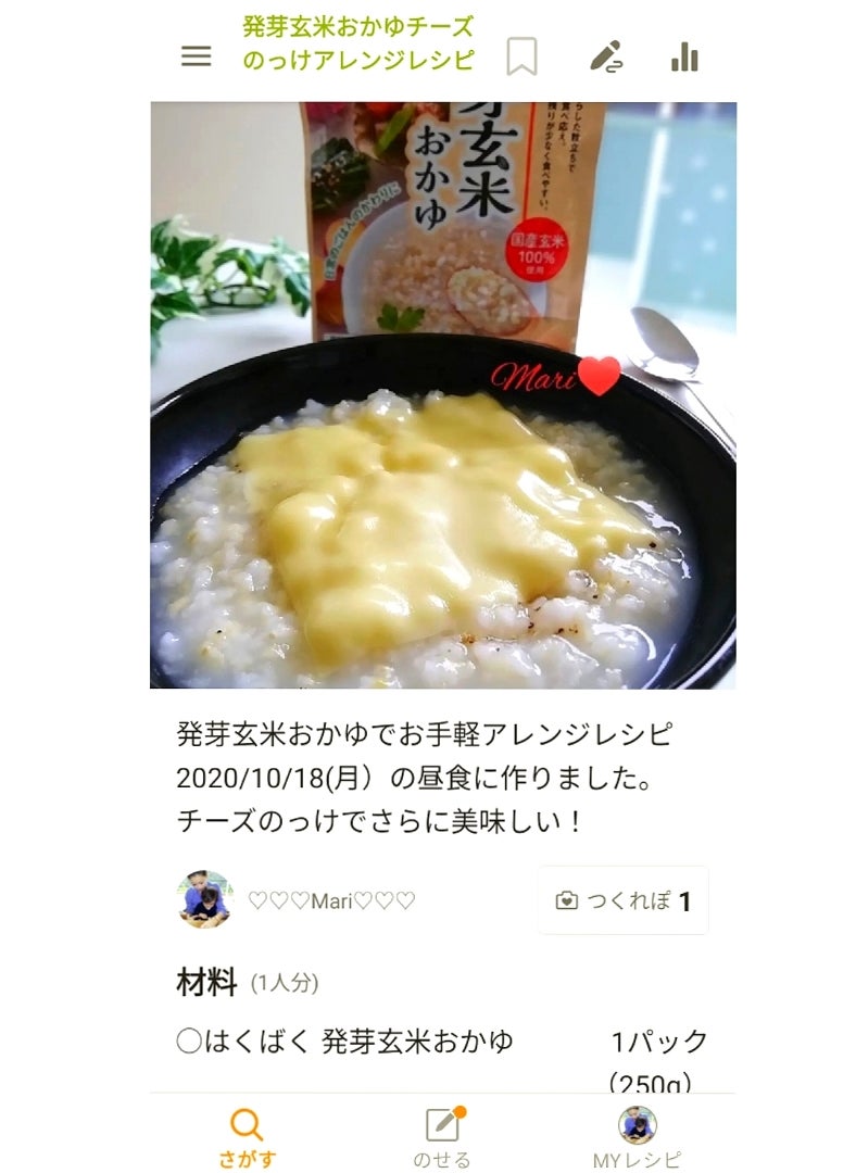 祝!つくれぽ 「発芽玄米おかゆチーズのっけアレンジレシピ」のつくれぽが公開されました、忍者村。Mari ごはん エトセトラ。