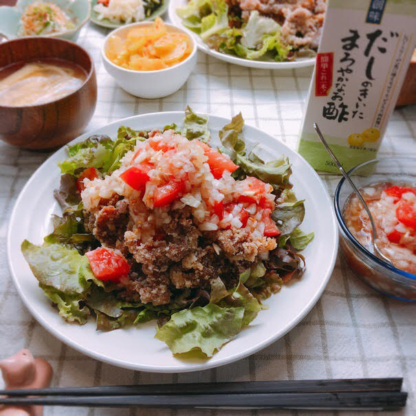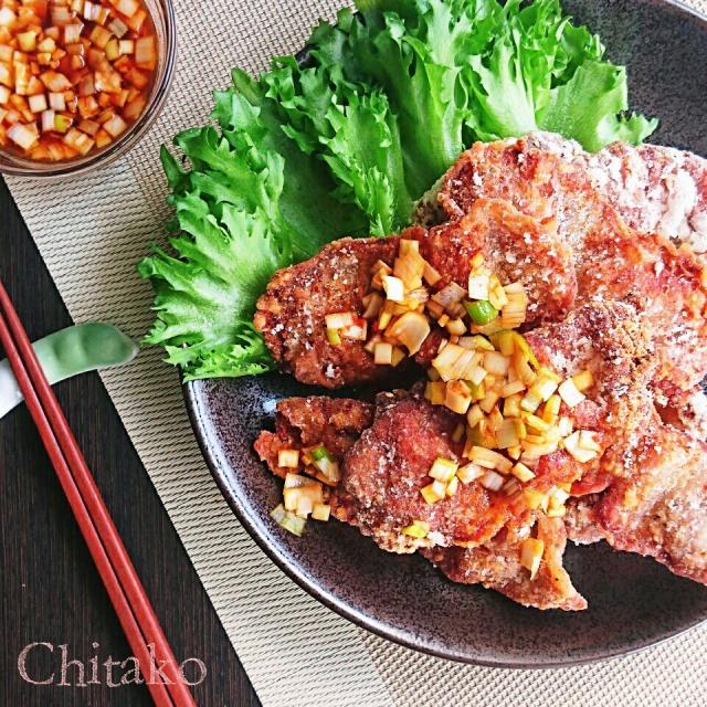 安くてもボリューム満点♡豚こまの竜田揚げ☆新玉ねぎとトマトのさっぱりだしまろサルサ毎日しあわせごはん*。