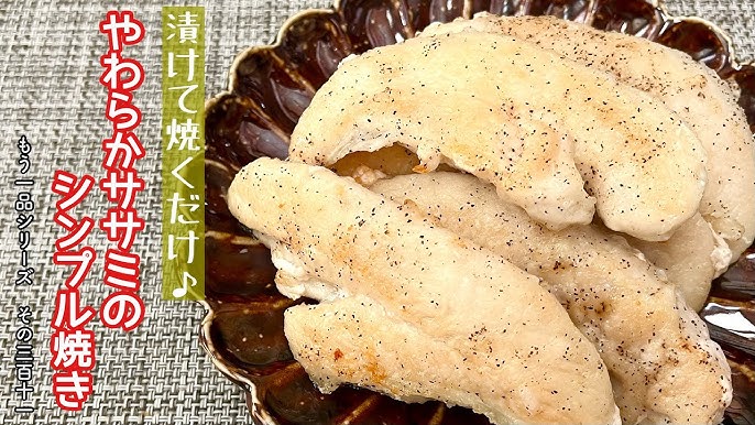 ササミガーリックステーキ 作り方☆鶏ささみ肉を柔らかくジューシーに仕上げる方法で調理した - YouTube。