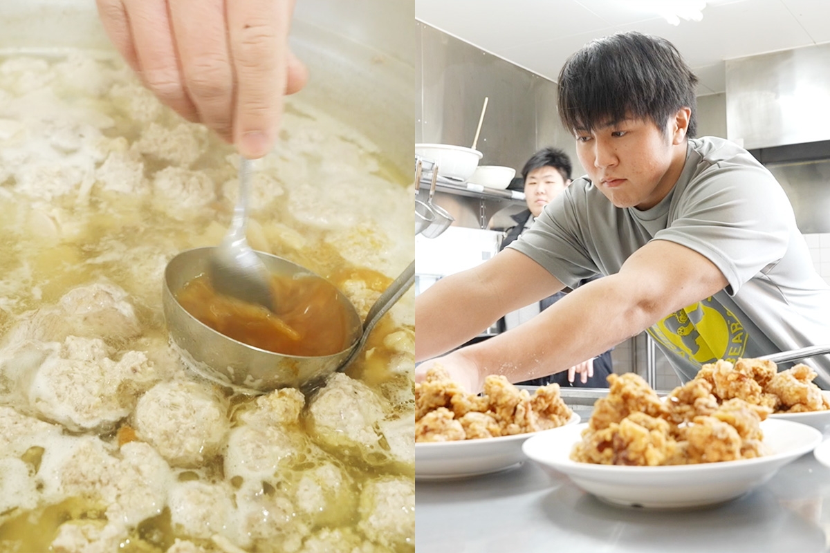 九重部屋の力士が塩唐揚げとちゃんこを紹介。