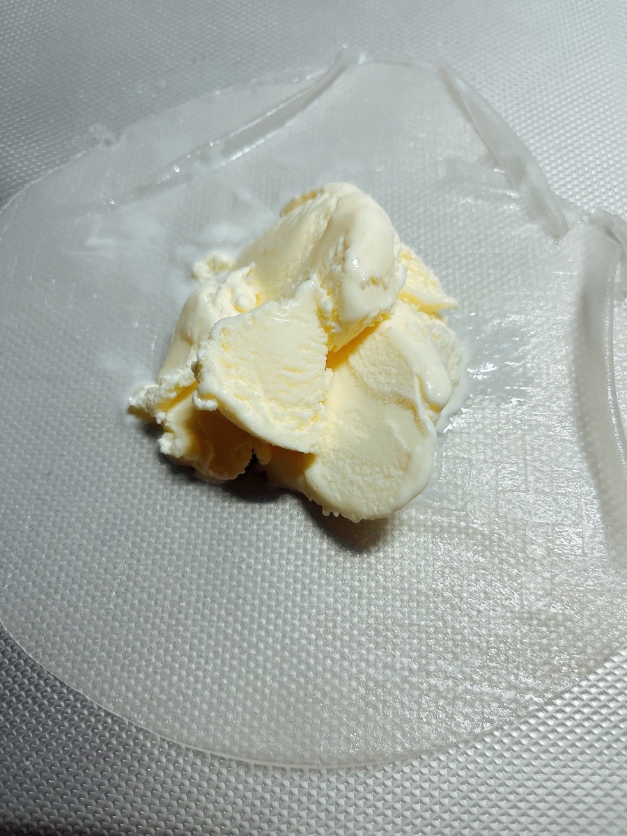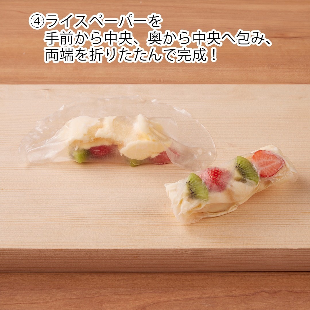 今回はライスペーパーを使った簡単もちっとアイス餅のレシピを紹介します!, ★材料, ・ライスペーパー, ・アイスクリーム お好み ,・フルーツ お好み , ・生クリーム, ◎・プリン風味クリーム ←今回のレシピで使用した弊社製品 , ・キッチンペーパー, ★レシピ,①ライスペーパー全体をさっと水にさらし、濡らしたキッチンペーパーの上に重ね、ライスペーパー全体に少し弾力が出て柔らかく。