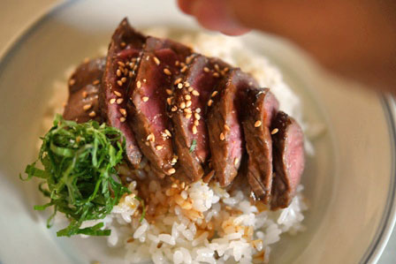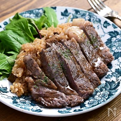 バター醤油がうまい!和風ステーキ丼のレシピ 作り方:白ごはん.com。