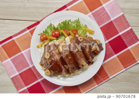 プレートに盛り付けた洋風なステーキ丼の写真素材90701678- PIXTA。