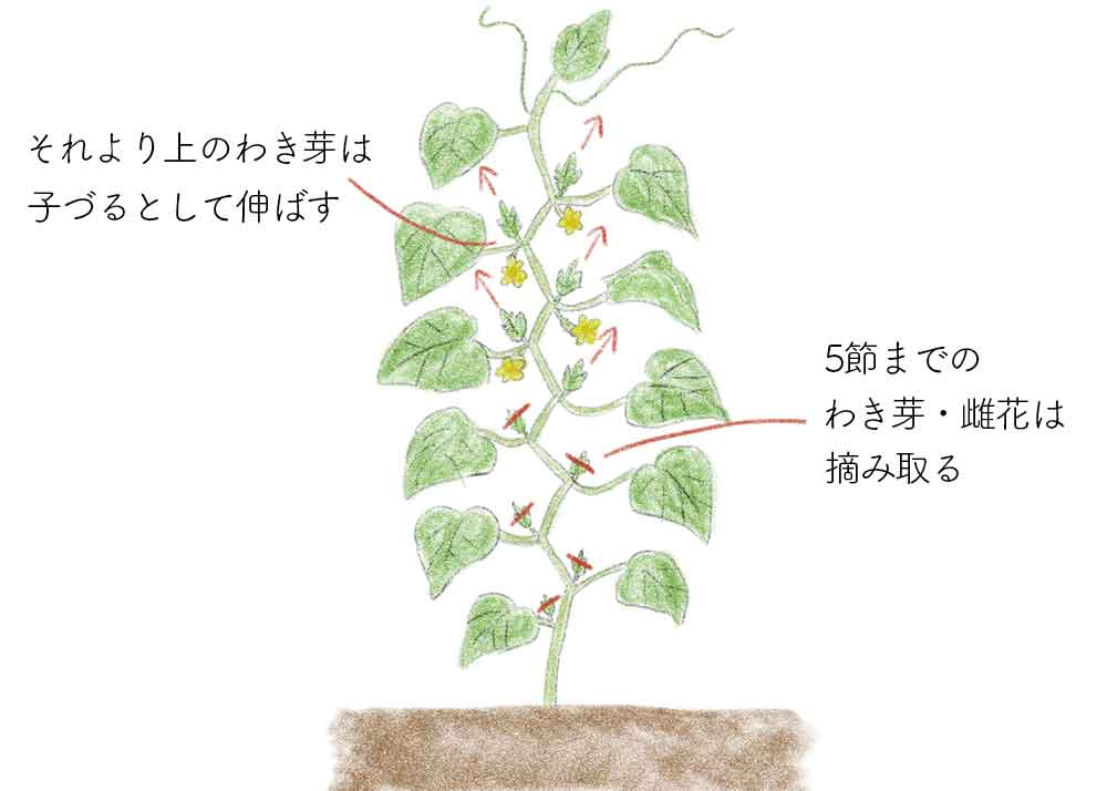 きゅうりの栽培方法:脇芽の摘心 キュウリの芽かき・子づるの摘心 - VR夏すずみキュウリの育て方 初心者向け有機栽培でおいしい野菜作り。