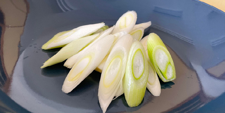 長ねぎを斜め切りにする - 海水100% 天日と平釜 日本の伝統海塩 「海の精 うみのせい 」。