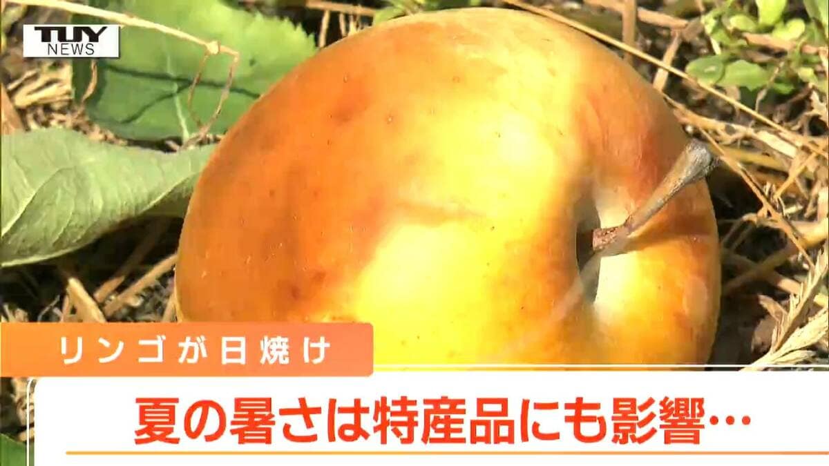 園地の地面に捨てられた腐ったリンゴ 夏の暑さの影響は特産品にも。