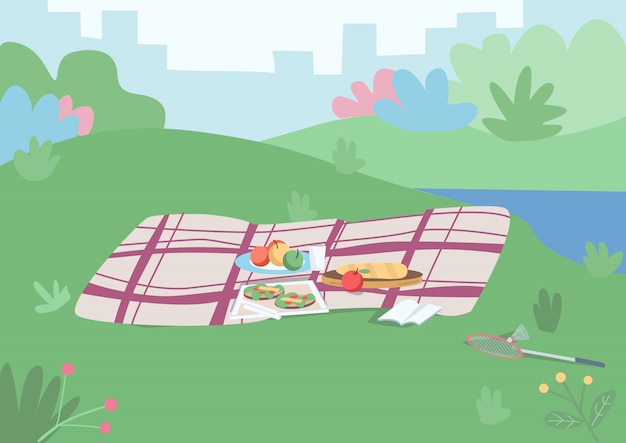市内の公園の芝生でピクニック 現代のベクトルイラスト 食事のバスケット 新鮮な果物の食欲的なサンドイッチと水のボトル 公共の庭の木の下で地面の昼食現代の都市風景の景色無料ベクトル素材。